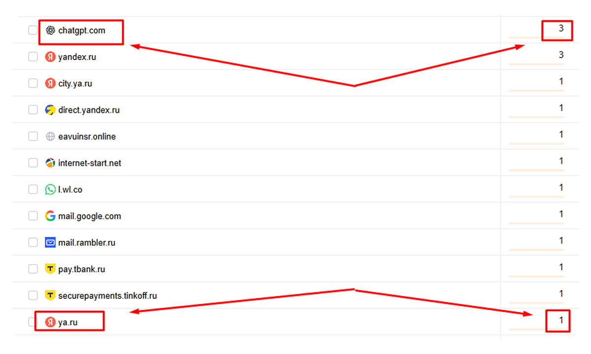 Пример такого отчета: на этом скриншоте мы видим, что 10 пользователей пришли к нам из GPT, а 8 – из ответов Алисы Яндекса.
